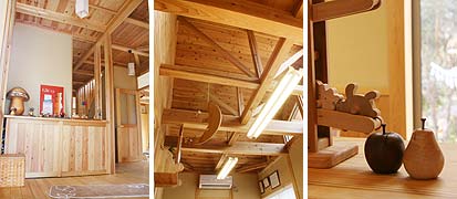 床、壁、建具をすべて杉、桧、松の無垢材で仕上げました。天井は無垢材を剥き出しとし、2F床と1F天井の板を38m/m 1枚板にしました。
