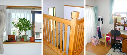リビングと、二階の子供部屋に出窓をつけて、小物を飾れるようにしました。玄関には、サイズと見た目を会わせるために、げた箱を手作りしました。二階の階段ホールは広さと明るさを感じられるように、手すりを格子にしました。