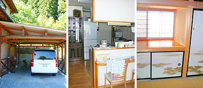 約5年前(平成14年頃)に2代目の自分が初めて、打ち合わせから、図面書き、墨付け、刻み、仕上げまでやった現場です。外部は和風にしたいということで、軒先を化粧にしました。横にある車庫も、丸太梁を使って外観に合わせました。